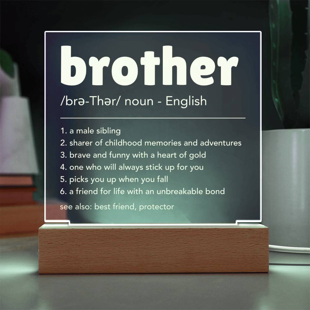 Celebrate the special bond you share with your brother with this beautifully crafted acrylic night light. Featuring heartfelt words that define what it means to be a brother—protector, best friend, and lifelong companion—this keepsake is both meaningful and stylish. With its warm glow and elegant design, it’s perfect for birthdays, Christmas, or simply reminding him how much he means to you. Every time your brother turns it on, he’ll feel the love and appreciation you hold in your heart.