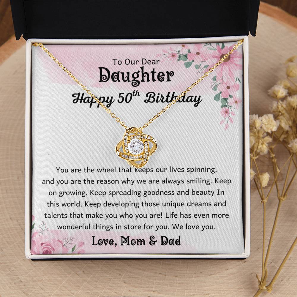 Show your daughter just how much she means to you with a gift that speaks from the heart. This love knot necklace is a timeless symbol of everlasting love, strength, and connection. Its delicate design represents the unbreakable bond you share, making it a meaningful keepsake she’ll treasure for years to come.