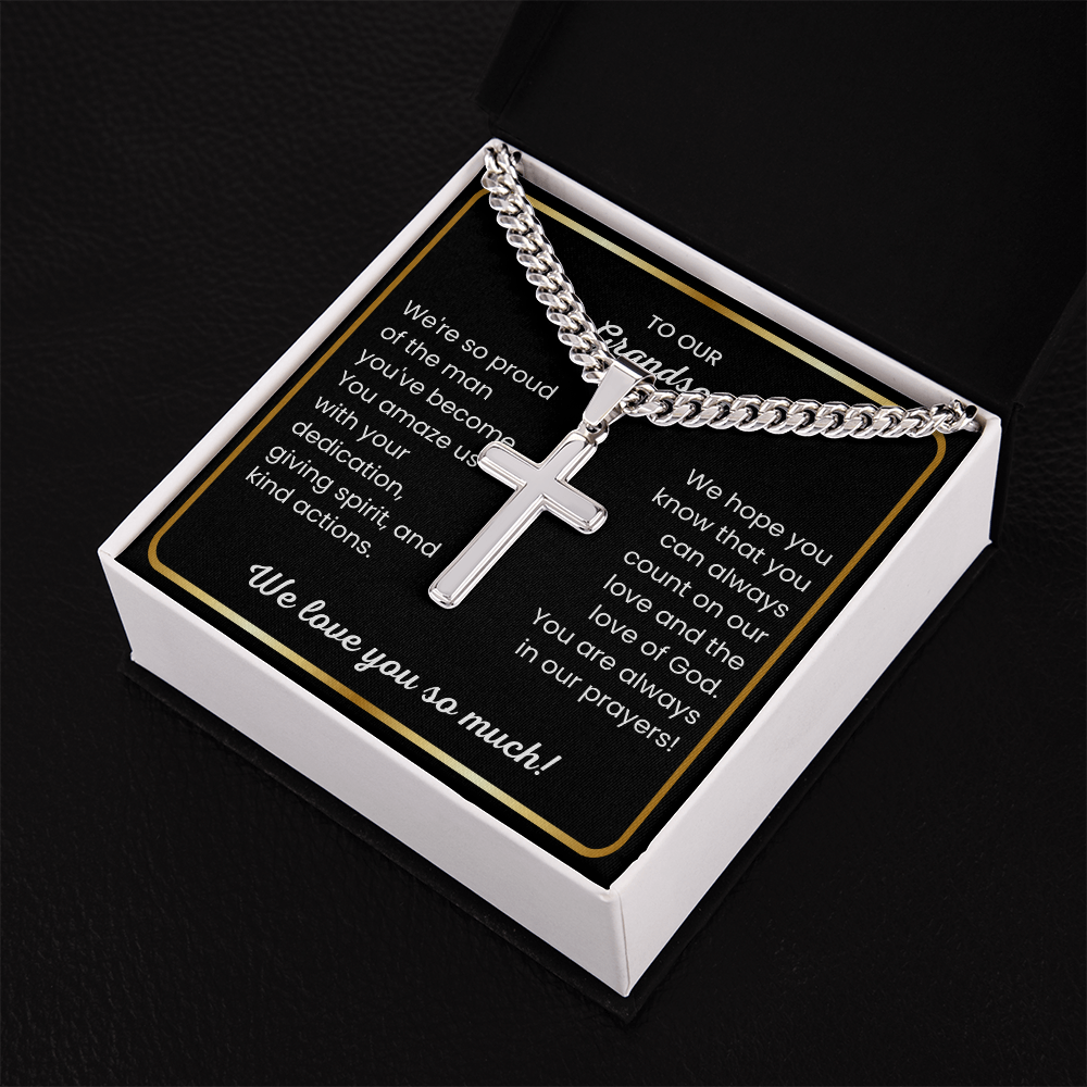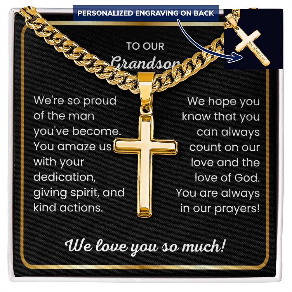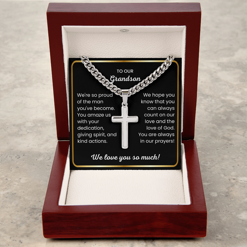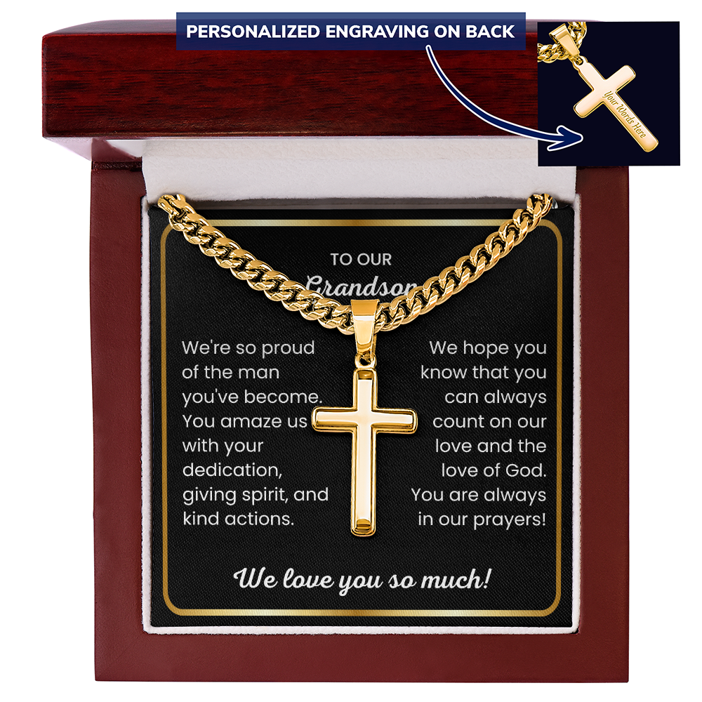 Combining the timeless symbolism of a cross with the bold style of a Cuban Link Chain, this necklace is both fashionable and meaningful. Designed for durability and everyday wear, it’s a keepsake that your grandson will treasure for years. Show him how proud you are with a gift that blends faith, style, and heartfelt sentiment in one unique accessory.
