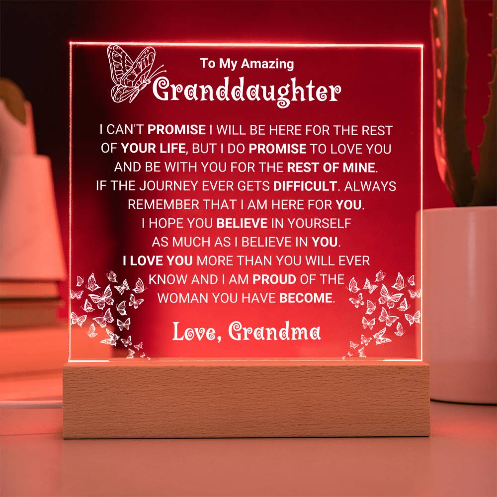 Give your granddaughter a gift that will stand the test of time. This square acrylic plaque carries a heartfelt message that makes her feel seen, loved, and appreciated. Designed to inspire and comfort, it’s the perfect keepsake for special occasions or simply as a daily reminder of your love.